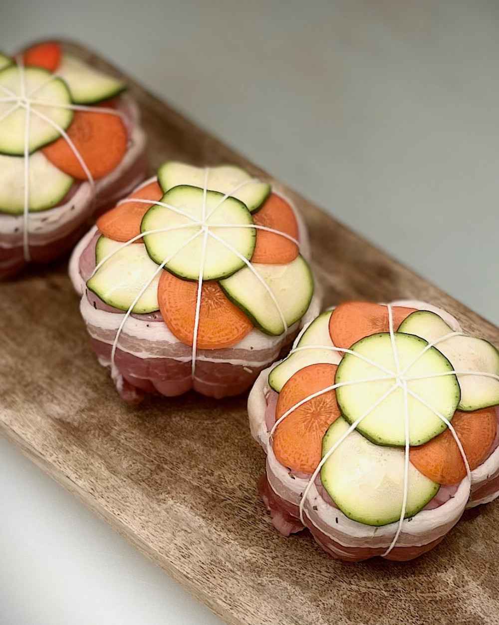 Farce Maison ( Porc et Veau ) garnie de petits légumes ( carottes / courgettes / oignons rouges ) entourée d'une escalope de dinde. Ficelée et lardée.