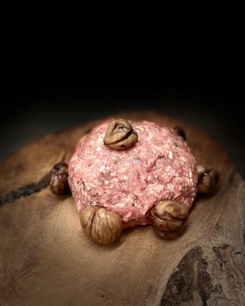 50% DE PORC 50% DE VEAU persil, sel, poivre, PORTO, épices, poudre de betterave, MARRONS